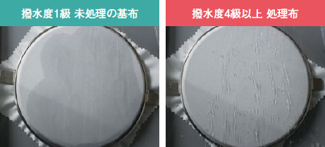 JIS L 1092のスプレー試験を実施した。未処理布は撥水度1級、処理布は撥水度4級以上を示した。